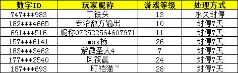 以下为本次部分惩罚名单,官方一如既往对游戏中的作弊行为进行严厉处理,并保留对第三方软件制作团队诉诸法律的权利,因此请大家远离第三方软件切勿以身试法,遵守公平竞技原则,共同维护和谐梦三!