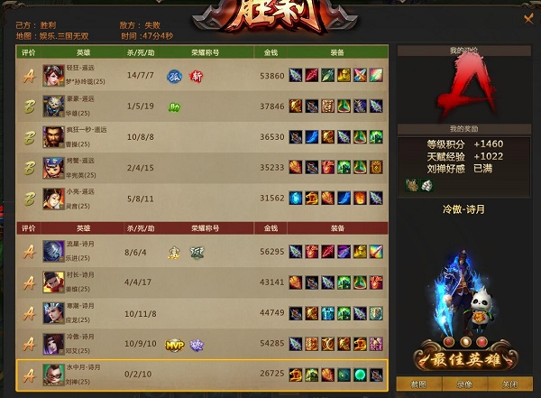 比赛回顾:开局3分钟,吴国方梦孙玲珑在队友华雄与灵音的帮助下击杀魏国方邓艾,敌将讨伐。比赛前期,吴国方曹操带动全场节奏,帮助己方建立较大的人头优势。15分钟,魏国方进攻吴国方上路防御塔,吴国方及时回防,吴国曹操反补防御塔,队友梦孙玲珑拿下双杀,吴魏双方人头比11:2。19分钟,魏国方在吴国方手中抢得炎魔之焰与号角。23分钟,吴国方击杀魏国方应龙与乐进,瓦解敌方号角攻势。比赛中期,魏国方凭借灵活阵容疯狂干扰吴国方发展,追回一定人头比分的同时,将经济方面反超吴国方。 33分钟,吴国方击杀魏国方三人,攻破魏国方中路高地,吴魏双方人头比20:11。34分钟,吴国方辛宪英争抢炎魔失败,魏国方再次拿到炎魔之焰和号角。38分钟,魏国方将领强行拖住吴国方五人,魏国方邓艾独自摧毁吴国上路高地。43分钟,双方在中路河道爆发团战,魏国方刘禅将买活的乐进重新召回战场,魏国方团战大获全胜击杀吴国方四人,吴魏双方人头比32:28。45分钟,魏国方团灭吴国方,攻破敌方剩余两路高地,直击摧毁吴国方虎神塔,恭喜魏国方诗月再胜遥远,锁定常规赛第二名出线。