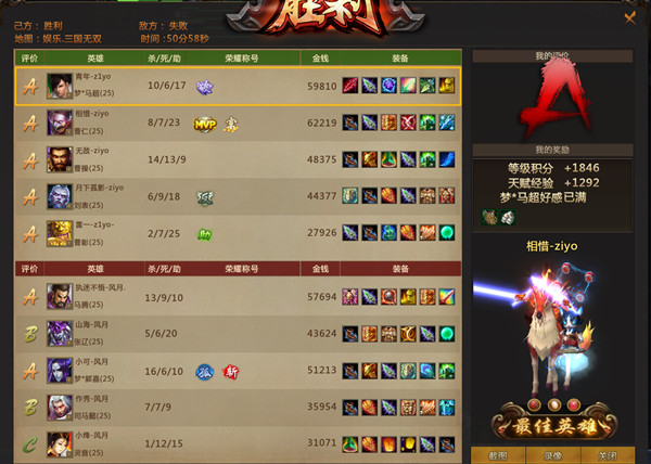 比赛回顾:开局2分钟,魏国司马懿和灵音后野区游走时发现了落单的吴国梦马超,魏国二人集火将其击杀,司马懿拿到一血。随后吴国曹仁、刘表、曹彰赶到支援,围攻二人,刘表击杀灵音,司马懿残血逃走。比赛前中期,吴魏双方围绕防御塔的攻守进行战斗,梦郭嘉通过三路gank连斩8名敌将,带动起了比赛节奏,魏国以16:8的人头比分领先。18分钟,吴国上、中两路路二塔被拆,双方争夺炎魔时,魏国梦郭嘉先行击杀吴国曹操,随后吴国刘表、曹彰二人也相继阵亡,魏国马腾快速拿到复活,司马懿得到号角。魏国吹响号角发起对吴国中下两路高地发起进攻,但均被吴国守住,双方开始互相推线,魏国经济小幅领先。34分钟,双方炎魔点开团,混乱之中吴国抢先击杀炎魔,虽然阵亡三人,但己方曹仁拿到复活,刘表获得号角,此时吴魏人头比为17:31。魏国丢掉炎魔后直接集结推掉吴国上路高地箭塔,吴国众人死保中路高地箭塔时,曹操和曹彰阵亡,但却将魏国团灭,曹仁拿到三杀。37分钟吴国刘表吹响号角,经过多轮进攻,魏国中下两路高地告破,双方人头差距仅有5个。47分钟,吴国在无人干扰下击杀炎魔,直接吹响上古号角,魏国仅剩的一路高地也随之告破。51分钟,魏国铜雀台被摧毁,吴国ZIYO获得本局比赛胜利。