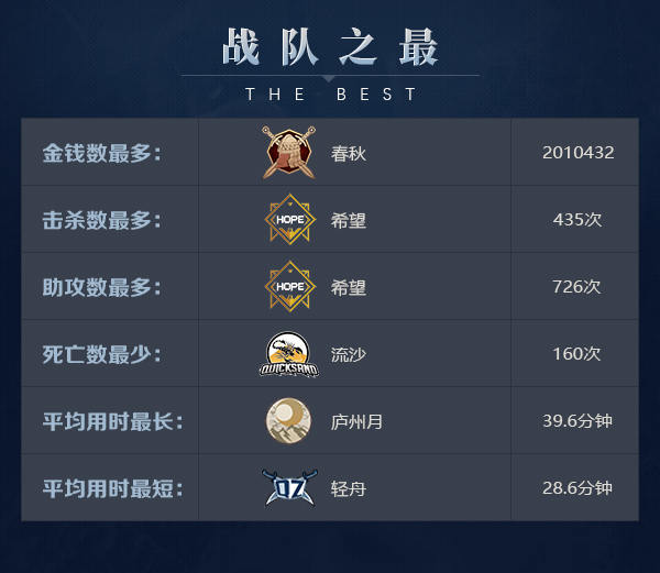 在比赛单局平均用时方面,庐州月单局平均用时最长,达到39.6分钟/局,而轻舟以28.6分钟成为单局平均用时最短的战队。