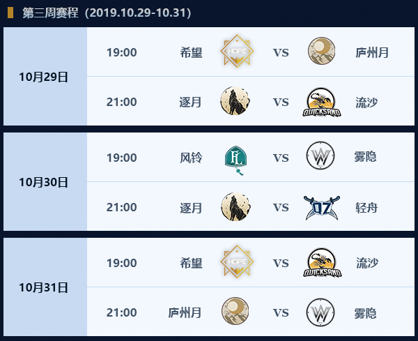 第二周比赛中除了积分榜前三名的激烈角逐外,积分榜第四名的争夺也异常激烈,庐州月、风铃、雾隐三支战队于第二周各增长4个积分。目前,希望、流沙、春秋已经瓜分掉3个季后赛资格,积分榜第4名将成为风铃、庐州月和雾隐的必争之位!