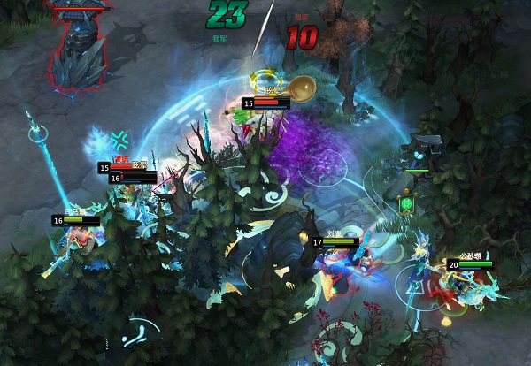 比赛开始5分钟,吴国颜良入侵魏国上路野区,魏国孔融帮助梦许褚将吴国颜良斩于马下,魏国梦许褚完成敌将讨伐。9分钟,吴国公孙瓒、刘表、司马昭进攻魏国下路二塔,魏国曹植站位太靠前被吴国3人合力击杀,吴国击杀领先4个,经济领先8K。15分钟,魏国4人进攻吴国下路一塔,吴国迅速集结4人防守,魏国遭到吴国突袭于吉、梦许褚阵亡,吴国公孙瓒切入后排击杀撤退的敌方曹植,吴魏比分22:10,吴国经济领先近2W。