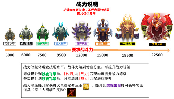 从上面的图片上不难看出,今后的战力等级,将和战斗力系统一同存在,当战斗力数值提升的时候,我们的战力等级也会随之增长,具体表现形式,就是头盔形象的进化。