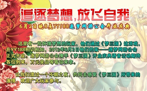 这里有一批怀揣梦想的玩家,他们通过《梦三国》在YY188这个平台相识相知,6月2日晚8点YY188逐梦网游公会携手《梦三国》大型公会开业语音活动欢迎各位到来,万元奖品等你来拿。让我们渡过一个不眠之夜共同感受《梦三国》所带来的激情,欢迎广大玩家加入逐梦网游公会这个大家庭。