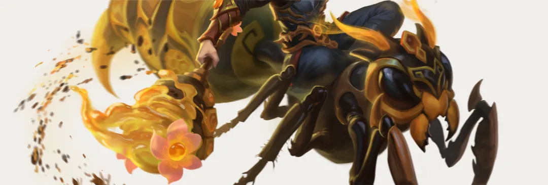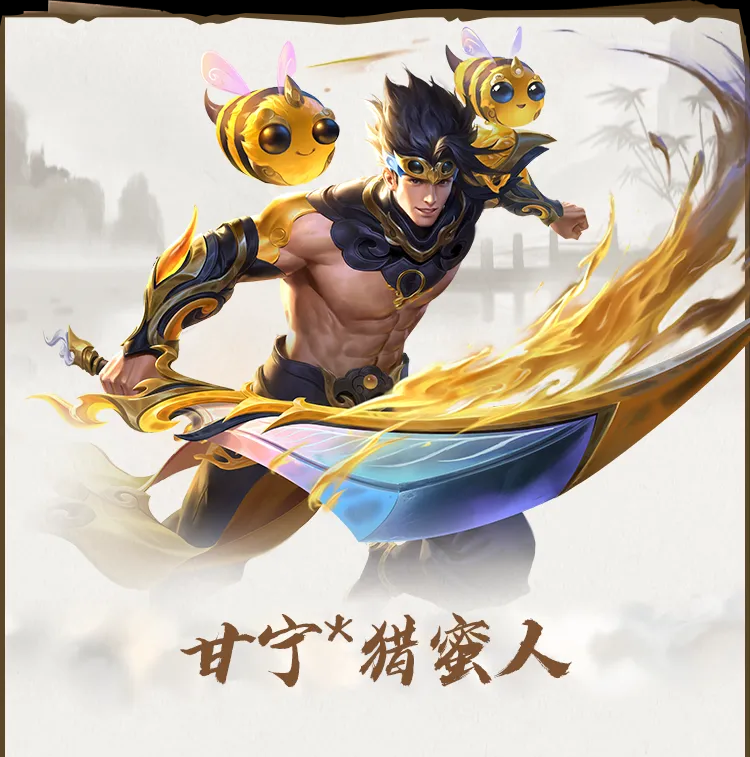 美术设计上,此次甘宁换装以“蜂猎蜜”为核心意象,色彩选取黑金为主调搭配蜜黄点缀,还原蜂身斑纹与蜜色质感。外观造型上,肩甲融入蜂巢结构,护额提取蜂眼元素,服饰纹路模拟蜂翼脉络,呈现蜜蜡的流光感与金属蜂纹的厚重感。