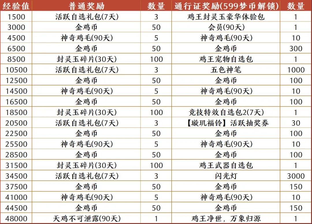 经验值奖励分为普通奖励与通行证奖励(消耗599梦三币解锁),包括鸡王换装体验包、金鸡币、五色神笔(春宴活动代币,可用于抽奖)、专属称号、福铃奖券、闪光灯、神奇鸡毛等。