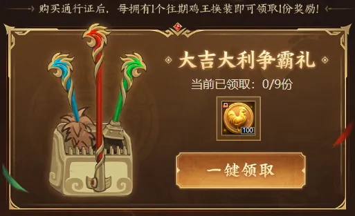 解锁通行证后,仙术师每拥有1个往期鸡王换装,可领取100金鸡币,最多领9次。金鸡币能用于争霸商店兑换心仪道具~