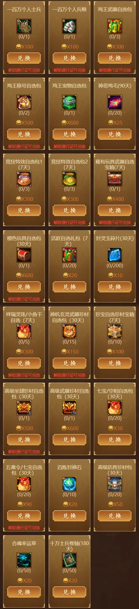 金鸡报喜,超值选兑。 本期积攒的金鸡币,能在争霸商店兑换神机玄灵武器珍材、百万士兵/兵粮、鸡王武器/宠物/称号、神奇鸡毛、祥瑞灵珠、百炼封神石等,部分需满足通行证条件。