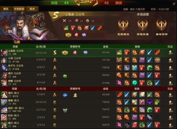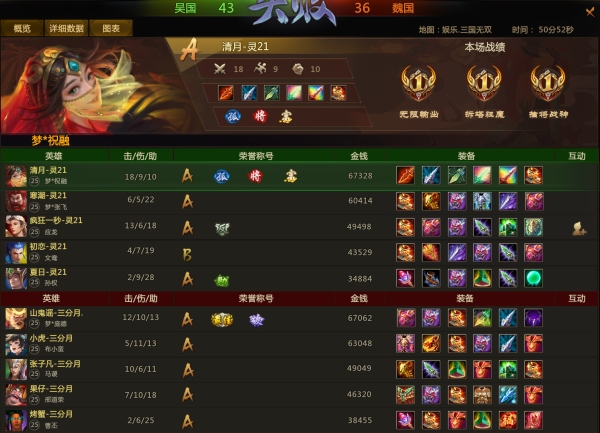 40分钟,双方在下路爆发团战,魏国众人默契配合0换4取得团战胜利并顺势摧毁吴国下路高地。此时双方比分21:43,魏国经济领先35000+。43分钟,吴国庞德看准时机进入敌方BOSS内成功夺得炎魔之焰与上古号角,队友见状迅速跟进将状态不佳的吴国众人全部击杀。45-54分钟,吴国巧妙运营多次击杀敌方落单人员,双方差距逐渐缩小。59分钟,双方各自封印敌方BOSS,吴国马腾获得炎魔之焰与上古号角,魏国黄月英获得巨熊掌。60分钟,吴国吹响上古号角集结上路推进。梦*马超一人在前吸引伤害,马腾则趁机摧毁魏国上路高地。61分钟,双方在中路爆发团战,吴国默契配合将敌方逐个击破并顺势摧毁敌方中路与下路高地。62分钟,魏国铜雀台被摧毁,吴国三分月拿下本场比赛胜利!