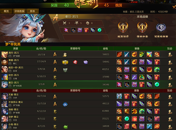 27分钟,魏国4人下路集火打残吴国夏侯渊,吴国4人支援反打魏国令其措手不及,吴国暗影吕轲、马腾打出高额伤害帮助己方无伤击杀魏国4人,吴魏比分24:26,魏国经济领先4K。32分钟,魏国封印己方BOSS上古炎魔,黄月英拿下复活和号角,吴国未能找到抢夺机会。34分钟,魏国吹响号角进攻吴国上路高地,吴魏爆发激烈团战,魏国凭借黄月英的复活无伤击杀吴国2人后攻破其上路高地;魏国继续压制吴国中路高地,吴国集火击杀魏国黄月英后己方马腾也阵亡,魏国梦马超攻破吴国中路高地,吴魏比分30:36。36分钟,魏国进攻吴国下路高地,吴国疲于处理兵线防守不及,魏国再破吴国下路高地。38分钟,吴魏于吴国BOSS点展开激烈团战,魏国3换4团战取胜后魔化刀兵摧毁了虎神塔,灵21取得第一局比赛的胜利。