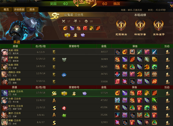 21分钟,吴国方吹响上古号角进攻魏国中路高地,但在魏国吕蒙和孙权大招的控制下吴国黄月英和夏侯渊被先后击杀,吴国文丑撤离不及也被集火击杀。27分钟,吴国方进攻魏国中路高地,魏国众人凭借孙权和吕蒙大招的控制击杀吴国孙权、马谡和文丑后逼退吴国方。32分钟,第二个上古炎魔在吴国BOSS处刷新,魏国众人击杀上古炎魔之际吴国马谡跳入炎魔处将炎魔击杀并抢到上古号角和炎魔之焰,随后吴国吹响上古号角缓解兵线压力。37分钟,吴国方团战失利被魏国方团灭,魏国趁机摧毁吴国中下路高地,此时吴魏比分37:56,魏国经济领先27000。39分钟,吴国众人在高地集火击杀魏国乐进后追击魏国布小蛮,魏国孙权趁机利用刷新统帅之印释放两个大招控制配合暗影吕轲击杀吴国马谡和顾雍,此时魏国比分达到59。40分钟,魏国众人在中路集火击杀吴国夏侯渊,至此魏国比分达到60获得本场胜利。