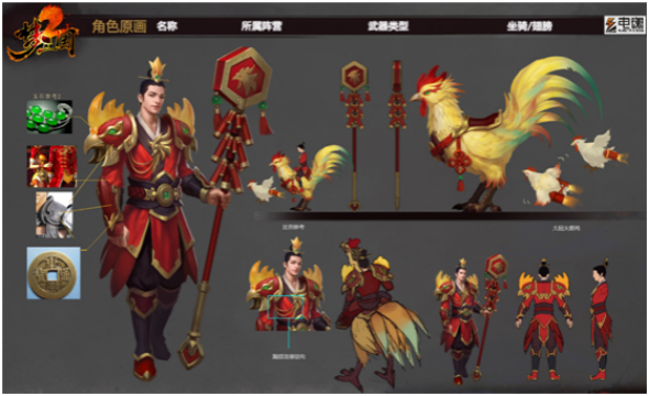人物设计上,保持发型不变,延续了肩膀覆盖肩甲的构造,并且添加了鸡头的元素。配色主要采用喜庆的红色和金色,点缀以糜竺原始造型的翠绿色。