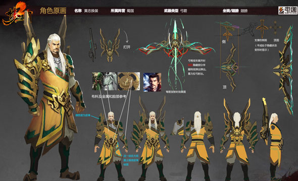 关于黄忠的服装配色方面,我们使用了蜀国的专有配色绿色与黄色,而在黄忠身上配饰的设计过程中,我们选择了更加接近蜀国的机械风格,就像黄忠背后的“翅膀”装饰那样,旨在让“神弩风流”换装与蜀国的现有装饰环境保持和谐统一。