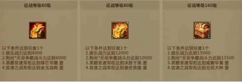 2、征战等级达到80级,且满足娱乐战力达到12000、荆州*天命争霸军衔达到10000、英霸官渡军衔达到决胜千里·壹、官渡之战军衔达到盖世英雄·壹4个条件里的任意1个,即可获得征战*王者印(120天)。