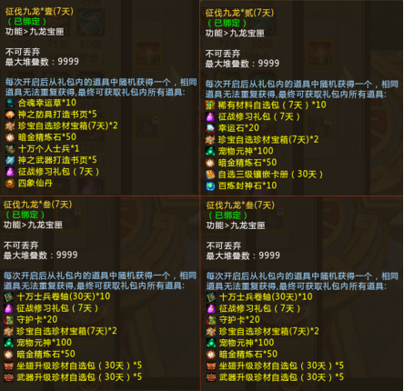 此外,激活檄文后一共可以获得31个征战九龙宝匣,其中包括征伐九龙*壹(7天)*8、征伐九龙*贰(7天)*8、征伐九龙*叁(7天)*8、征伐九龙*肆(7天)*7。仙术师可通过等级提升,累计获得宝匣内的所有道具。