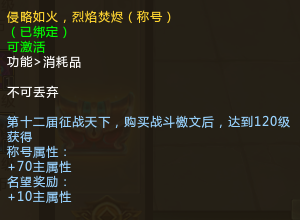 征战天下等级达到120级并激活檄文后可获得称号:侵略如火,烈焰焚烬。属性如下: