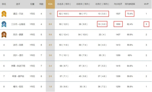 遇见 - 琦仔在5号位选手中,KDA、场均击杀、场均助攻、场均最低阵亡以及参团率都是排在第一位,其中场均助攻数值高达22.3,仅有分均经济这一项以微弱差距落后于三分月 - 烤蟹。