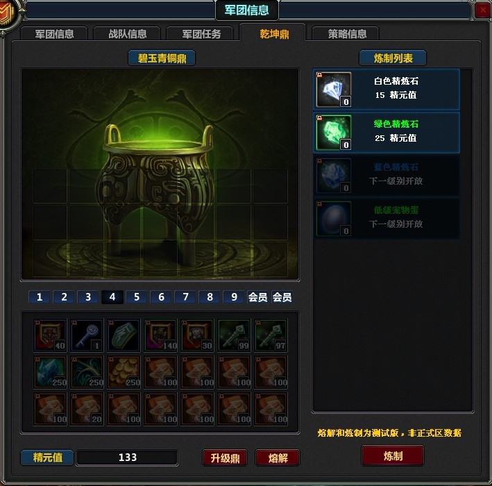 【升级鼎】该按钮只有军团长才可以使用,通过消耗军团资源(士兵和兵粮)来提升乾坤鼎的等级