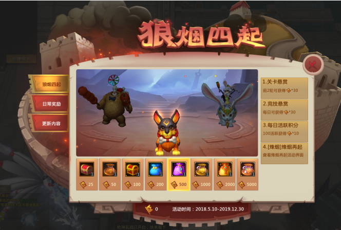 开放狼烟四起主题活动和兑换。主题界面中,我们投放了多种多样的奖励,包括换装“茕茕白兔”、全新宠物“熔岩恶犬”以及诸多稀有材料等等。