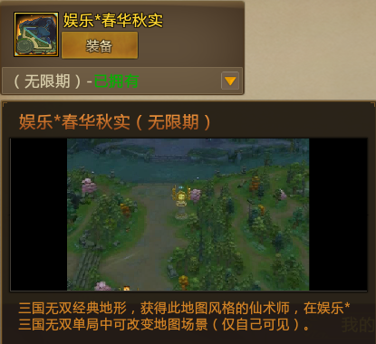 参与一局娱乐*三国无双,即可获得【娱乐*春华秋实(无限期)】