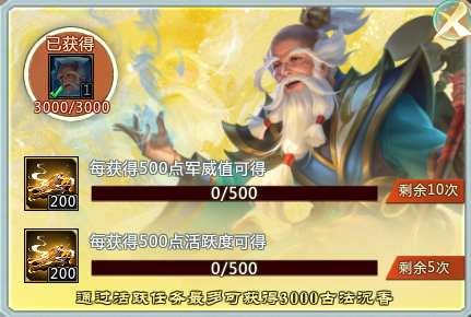 仙术师每累计500点活跃度/军威值,均可免费获取200古法沉香,最多可得3000古法沉香。