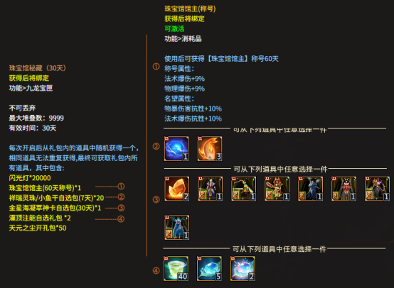 20轮后则有古玉流芳称号自选包、苍龙北斗天赋书、配饰高炼11/灵脉晶髓自选、二重15级地魂觉醒+1卷(配饰)等价值更高的奖励道具。