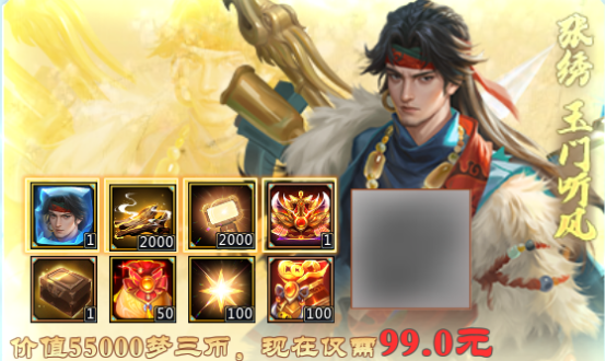 张绣*玉门听风、古法沉香*2000、闪光灯*2000、天地劫神魔道武器自选包*1、珠宝馆秘藏*1、五禽令/七宝自选*50、闪光值卷轴*100、十万士兵卷轴/烽火兵符自选*100。