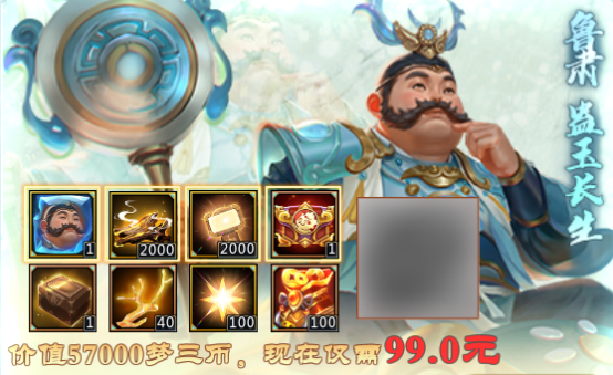鲁肃*蛊玉长生、古法沉香*2000、闪光灯*2000、圣灵宠物自选福袋*1、珠宝馆秘藏*1、灵脉晶髓*40、闪光值卷轴*100、十万士兵卷轴/烽火兵符自选*100。