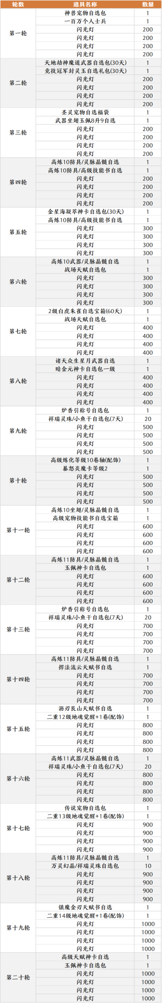 前20轮奖励中,每轮除2个核心奖励外,其余4个均为闪光灯。