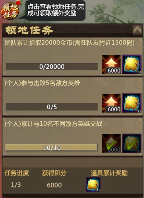 嘉年华版本更新后,每次进入领地战地图时,会自动接取3个领地单局任务,完成任务可获得独有的占领积分和军饷奖励。