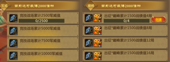 1/12-1/18:解锁第二排军威值和出征*巅峰战绩值任务,累计可达2000战斗信物;