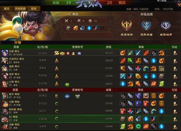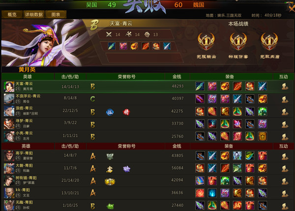 开局3分钟,吴国周仓利用一技能突袭魏国梦郭嘉却被其开启大招衔接二技能反杀,梦郭嘉完成敌将讨伐。7分钟,吴国摧毁魏国下路一塔。8分钟,双方在上路爆发团战,吴国暗影吕轲开启大招配合吕蒙一技能控制击杀魏国夏侯惇和左月后利用二技能冲入河道处收割残血梦郭嘉,魏国文丑利用大招控制击杀吴国黄月英后被吴国吕蒙收割。11分钟,双方再次在上路爆发团战,魏国文丑先手利用大招控制配合梦郭嘉击杀吴国黄月英和吕蒙,紧接着魏国夏侯惇在河道处配合文丑击杀吴国周仓。17分钟,双方在中路爆发团战,魏国文丑先手大招控制击杀吴国左月后配合祝融击杀吴国黄月英,吴国周仓利用一技能想要收割祝融却被其利用二技能躲避,紧接着魏国众人集火击杀吴国周仓和暗影吕轲。19分钟,上古炎魔在吴国BOSS处刷新,吴魏双方在炎魔处展开争夺战,魏国文丑利用大招收割上古炎魔后抢到上古号角、吴国黄月英获得炎魔之焰,在吴国吕蒙和左月的轮番控制下魏国方团战失利被接连击杀,此时吴魏比分32:40,魏国经济领先6000。