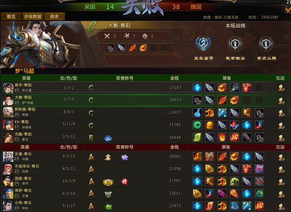 开局2分钟,魏国刘表入侵吴国野区被吴国三人围攻击杀,曹丕完成敌将讨伐。4分钟,魏国四人集结下路击杀吴国曹丕和孙鲁班后摧毁吴国下路一塔。7分钟,魏国方凭借马腾和刘协前期的压制力接连摧毁吴国上路一二塔。9分钟,魏国摧毁吴国中路一塔,魏国文鸯利用大招控制配合袁术击杀吴国布小蛮。14分钟,魏国文鸯在中路先手利用大招控制配合队友击杀吴国周瑜,吴国孙鲁班撤离不及也被围攻击杀,随后魏国摧毁吴国中路二塔撤退。16分钟,双方在下路爆发团战,魏国众人利用刘协大招传送至吴国野区突袭吴国众人后方,魏国文鸯先手利用大招配合马腾击杀吴国梦马超,魏国袁术则开启大招突进至吴国曹丕身旁将其击杀,吴国周瑜赶到支援后利用大招衔接妖法祭灵法杖控制魏国马腾却并未将其击杀,紧接着马腾在魏国文鸯和袁术的帮助下接连击杀吴国周瑜、布小蛮和孙鲁班,至此吴国方被团灭,此时吴魏比分14:23,魏国经济领先15000。