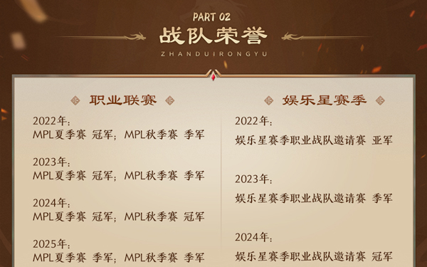 8年间勇夺6次MPL赛季冠军,3次星赛季总冠军,3套冠军皮肤,这些荣誉见证了这支队伍的鼎盛时期。