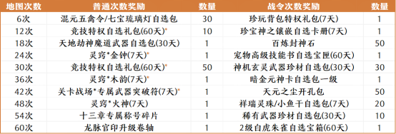 赛季期间共通关60次地图,即可免费领取竞技特权、天地劫神魔道武器、灵窍、关卡战场专属武器突破符、称号碎片、龙脉官印升级卷轴等在内的普通次数奖励。