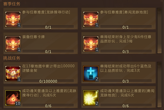 赛季任务每周解锁4个(未完成的任务可继续完成),包括参与十三章两个地图、装备将星卡、累计指定品质的将星卡等等,每完成一个任务均可领取1份霸业寻龙*密宝。