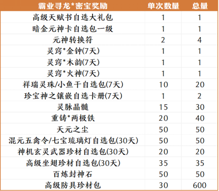 总计可得20份霸业寻龙*密宝,全部开出天赋书、暗金元神卡、灵窍、祥瑞灵珠、神机玄灵、百炼封神石等以下道具: