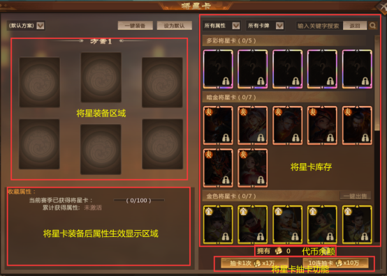 装备区域:可将已收集的将星卡装备至方案中,每次进入十三章关卡(其他地图不生效)会消耗装备将星卡1张,并获得对应加成。