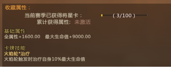 [收藏属性]:累积获得一定数量将星卡之后(赛季内每累积获得100张将星卡,将获得3%全属性提升,至多30%),将获得十三章单局内属性提升。收藏属性加成自动生效,不与装备将星卡方案关联。