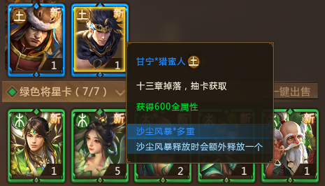库存区域:显示目前收集到的将星卡情况,包括数量和属性。