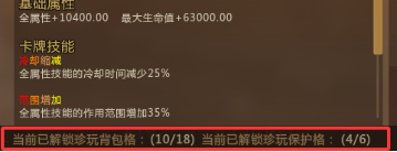 [珍玩保护]:珍玩保护格可保护玩家单局内当前获得的珍玩,保护格内的珍玩在玩家败阵时不会损失,单局失败也可正常带出。每位玩家初始拥有2个珍玩保护格,上限为6个,可通过完成十三章成就任务解锁珍玩背包格。