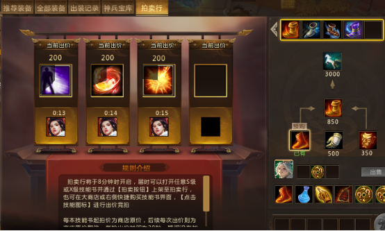 天命.荆州争霸商店新增拍卖行专区,仙术师们可以在此上架和竞拍技能书,拍卖行将于8分钟时开启,届时可以打开任意S级或X级技能书,通过【拍卖】按钮将其上架至拍卖行,其他玩家(除队友外)都可以【点击技能图标】出价竞拍,每本技能书的起拍价为商店原价(小技能200,大招400),后续每次出价则累加商店原价,以大招为例,每次出价为400/800/1200以此类推。每本技能书有20秒的竞拍时间,时间结束则成交或流拍,流拍后技能书将按商店原价由系统回收并返还金钱。更多详细规则可待玩法更新后,在大商店的拍卖行规则介绍处查看。