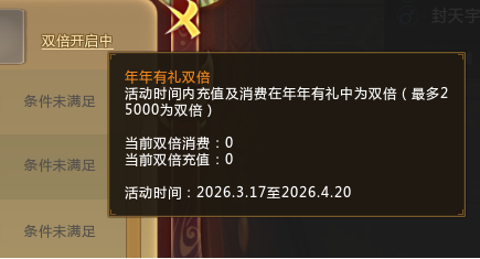 2026年3月17日- 4月20日,期间充值及消费在年年有礼中为双倍(最多25000为双倍)