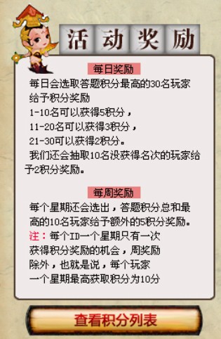 大家还在为董卓成就没令牌而苦恼么?还在为没收集到绝版的装备而惋惜么?还在为极品装备太贵而不能拥有?这些都不是问题,只要你每天坚持答题,一切都将成为浮云!!!极品绝版装备统统收入囊中!!!赶快叫上好朋友好兄弟一起来参加吧!!!