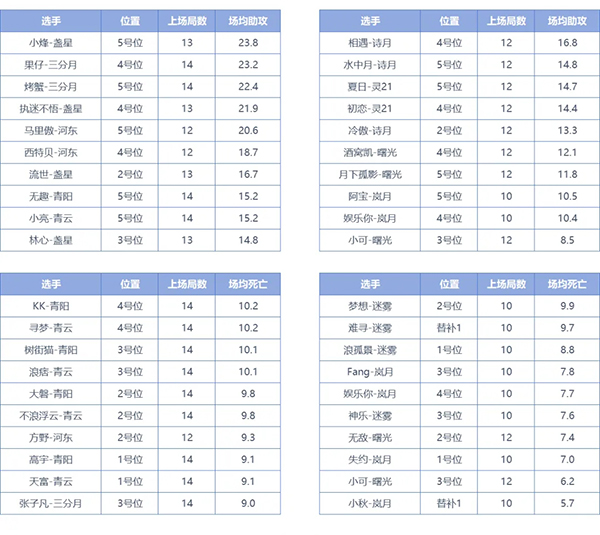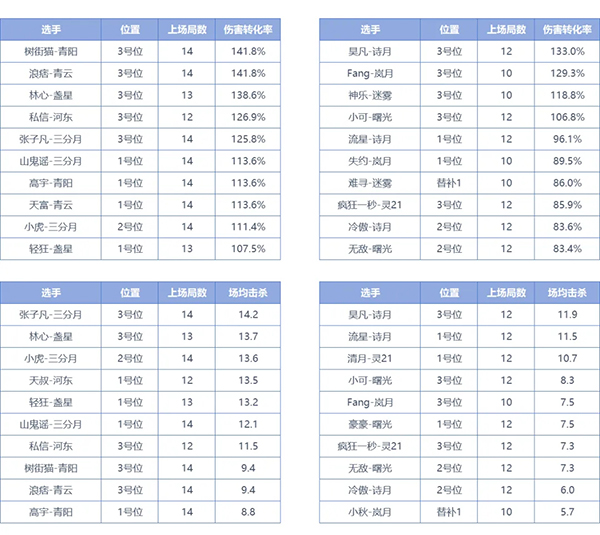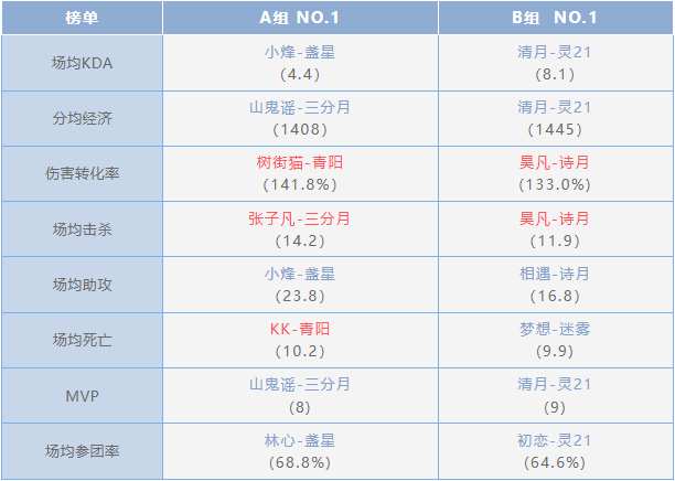本周我们对选手数据:场均KDA、分均经济、场均击杀/助攻/死亡、伤害转化率、MVP、场均参团率,进行了TOP10排名更新,具体见下图所示: