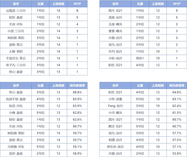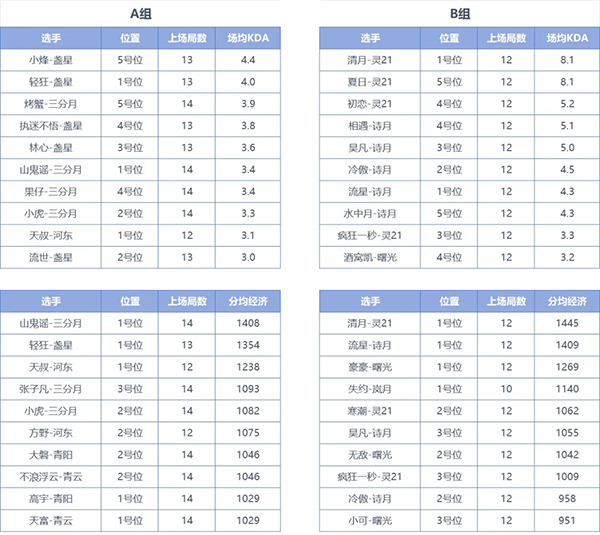 经过三周的比拼,梦梦发现B组均为2:0的比分,而常规赛目前所有2:1的比分对决均被A组包揽,可见A组的竞争压力巨大。场均耗时第一名也被盏星以43.37分钟拿下。