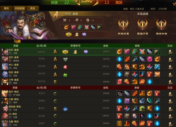 15分钟,魏国马谡和吕蒙被吴国周瑜击杀,吴国周瑜成功拿到玄蛇胆,吴魏比分11:12,吴国方经济领先超过1万。比赛后期,吴国马腾和夏侯渊都做出御魔*青钢枪,吴国方团战连捷,经济大幅领先。18分钟,吴国方强势封印上古炎魔,吴国马腾拿到炎魔之焰和上古号角。20分钟,吴国方吹响号角摧毁魏国中路高地。21分钟,魏国方防守下路失利,魏国周泰和孙权接连阵亡,吴国方趁势摧毁魏国下路高地,吴魏比分19:13。23分钟,吴国方以3万的经济优势一波摧毁魏国上路高地和铜雀台。吴国方获胜!