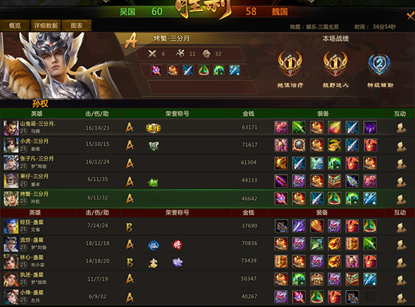 开局3分钟,魏国3人入侵吴国下路野区,吴国3人与魏国展开团战,吴国6级马腾利用等级优势击杀文鸯完成敌将讨伐。11分钟,魏国梦庞统上路处理兵线,吴国董卓一技能拉回梦庞统后大招将其控住,梦周瑜跟进补充伤害击杀魏国梦庞统,吴魏人头比13:18,吴国经济领先3K。20分钟,魏国快速封印己方BOSS上古炎魔,梦刘备拿下复活和号角,吴国击杀落后10个并未抢夺炎魔。23分钟,魏国吹响号角但并未攻破吴国任何一路高地。33分钟,吴国BOSS点外爆发炎魔争夺战,吴国通过逐个击杀的策略团战2换4取胜,吴国回身击打炎魔时魏国布小蛮、梦刘备抢夺失败阵亡,马腾封印炎魔拿下号角,姜维拿下复活,吴魏比分33:45,魏国经济领先8K。
