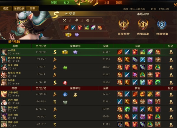 41分钟,吴国方进攻魏国中路高地,吴国方在左月和吕蒙大招控制下掌握团战优势接连击杀魏国众人后摧毁魏国中路高地。45分钟,饕餮神主刷新后被吴国方击杀;魏国方击杀第三个上古炎魔,梦庞德获得炎魔之焰及上古号角,随后魏国孙权利用大招控制配合梦庞德击杀吴国梦祝融,但在魏国缺乏控制能力后吴国梦周瑜等人轮番拉扯消耗接连击杀魏国众人,魏国方被团灭,吴国众人趁机摧毁魏国下路高地,此时吴魏比方52:38,吴国经济领先17000。47分钟,魏国吹响上古号角缓解兵线压力进攻吴国中路高地,但在吴国方的高机动性和控制能力下魏国众人再次失利惨遭团灭,吴国比方达到58。53分钟,吴国方进攻魏国上路高地,吴国梦祝融在魏国法正大招的控制下被秒杀,紧接着吴国应龙利用二三技能配合孙权大招控制控制吴国众人,吴国方被团灭。57分钟,吴国梦关羽在中路利用一技能衔接二技能拉回魏国梦庞德后吴国左月和吕蒙紧跟控制配合梦祝融击杀梦庞德,紧接着吴国梦周瑜切入魏国后排配合梦关羽击杀魏国孙权,至此吴国比分达到60获得本场胜利。