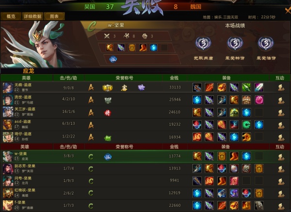 15分钟,魏国方进攻吴国下路高地,吴国钟会和孙权先手利用大招控制清理兵线但却被魏国方集火击杀,紧接着魏国暗影吕轲开启大招打出高额爆发配合队友团灭吴国方并接连摧毁吴国中下路高地。17分钟,魏国方进攻吴国上路高地,魏国暗影吕轲先手跳上吴国高地利用大招衔接一二技能秒杀吴国钟会后配合梦刘备击杀吴国梦刘禅和孙尚香,随后魏国众人一鼓作气摧毁吴国上路高地和虎神塔,魏国获得本场胜利。